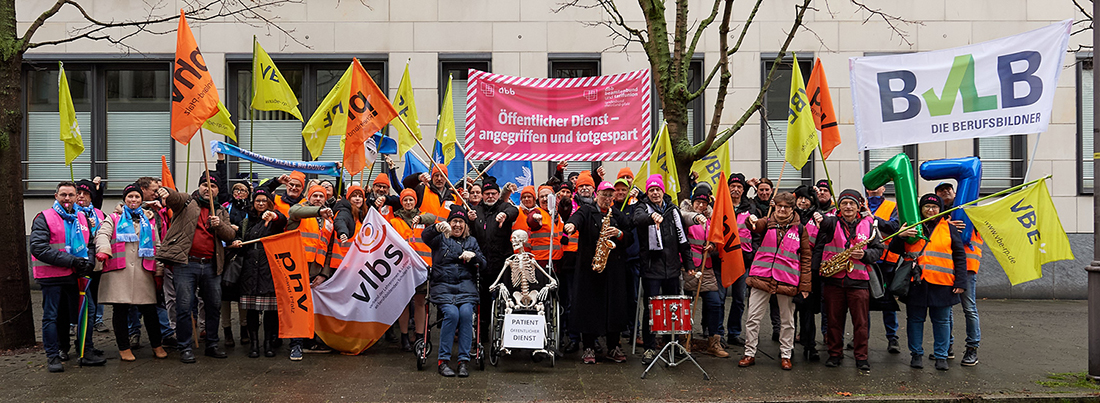 Szenisch wurde dies durch den „Patienten Öffentlicher Dienst“ verdeutlicht, der am Tropf hängt und nur noch als Skelett im Rollstuhl sitzt, begleitet von live gespieltem Chopins Trauermarsch. Damit sollte gezeigt werden, dass immer mehr Aufgaben mit immer weniger Personal, veraltete IT-Strukturen und ein unüberschaubares Paragraphen-Dickicht den öffentlichen Dienst zunehmend überlasten.